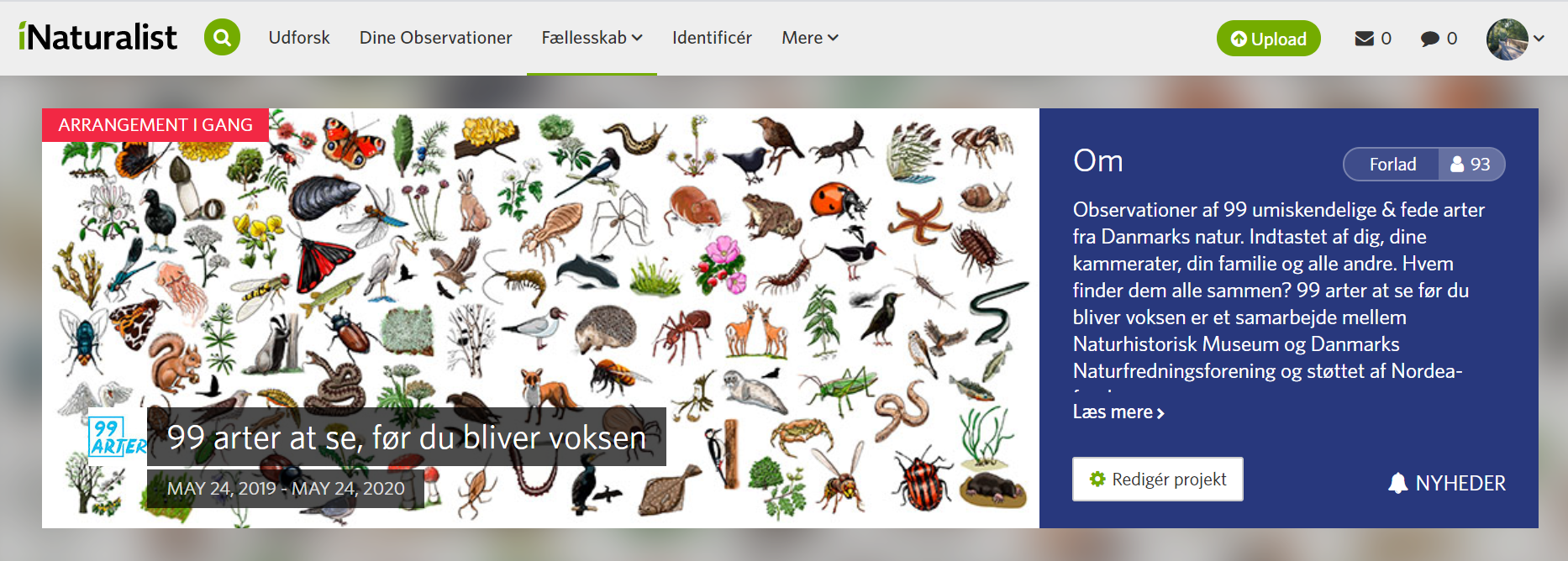 iNaturalist er en hjemmeside og en gratis app, hvor du kan få navn på alle de arter, du finder i naturen.Hvis du klikker på billedet nedenfor, kan du se, hvor mange observationer af de 99 arter, som er sendt ind siden projektet begyndte